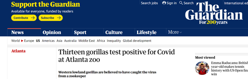 据英国《卫报》11日消息,美国亚特兰大动物园13只大猩猩新冠病毒检测结果呈阳性,而它们可能从饲养员那里感染了病毒。